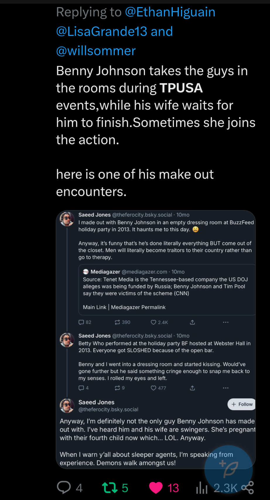 On August 5th Scott alleged that TPUSA featured speaker and paid Influencer “Benny Johnson takes the guys in the rooms during TPUSA events, while his wife waits for him to finish. Sometimes she joins the action. here is one of his make out encounters.” A screenshot of a post from Saeed Jones is shown saying “I made out with Benny Johnson in an empty dressing room at BuzzFeed holiday partying 2013. It haunts me to this day. Anyway it’s funny that’s he’s done literally everything BUT come out of the closet.” and “Benny and I went into a dressing room and started kissing. Would’ve gone further but he said something cringe enough to snap me back to my senses. I rolled my eyes and left.” and “Anyway I’m definitely not the only guy Benny Johnson has made out with. I’ve heard him and his wife are swingers. She’s pregnant with their fourth child now which… LOL. Anyway. When I warn y’all about sleeper agents, I’m speaking from experience. Demons walk amongst us!”