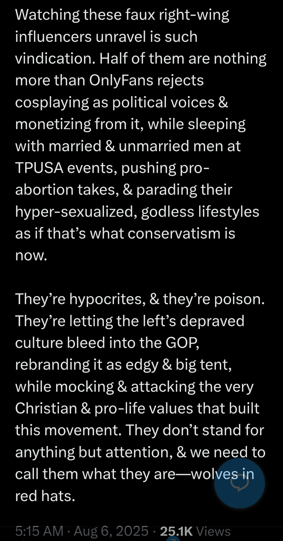 And @reeseonable posted “Watching these faux right-wing influencers unravel is such vindication. Half of them are nothing more than OnlyFans rejects cosplaying as political voices & monetizing from it, while sleeping with married & unmarried men at TPUSA events, pushing pro-abortion takes, & parading their hyper-sexualized, godless lifestyles as if that’s what conservatism is now. They’re hypocrites, & they’re poison. They’re letting the left’s depraved culture bleed into the GOP, rebranding it as edgy & big tent, while mocking & attacking the very Christian & pro-life values that built this movement. They don’t stand for anything but attention, & we need to call them what they are—wolves in red hats.”
