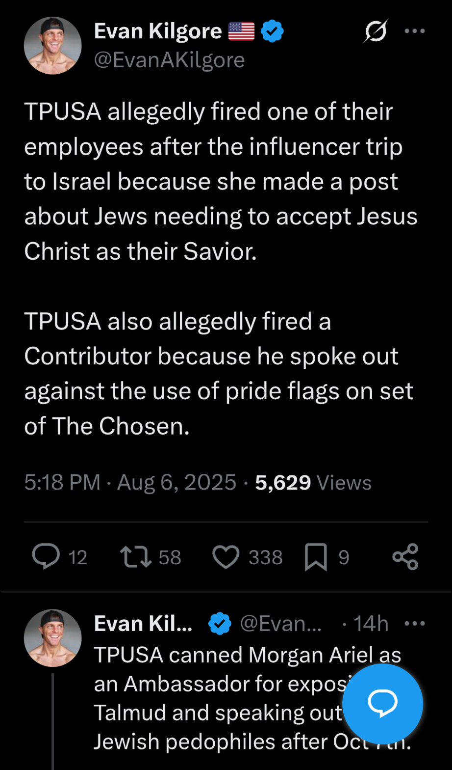 Evan Kilgore made further allegations saying “TPUSA told me to remove all public affiliation with them after Jenna Ellis and Dan Bongino falsely smeared me and made fun of me for calling them out. There is a history of TPUSA always siding with those who oppose real Conservative Christian values and I’m done being silent.” and “TPUSA allegedly fired one of their employees after the influencer trip to Israel because she made a post about Jews needing to accept Jesus Christ as their Savior. TPUSA also allegedly fired a Contributor because he spoke out against the use of pride flags on set of The Chosen.”