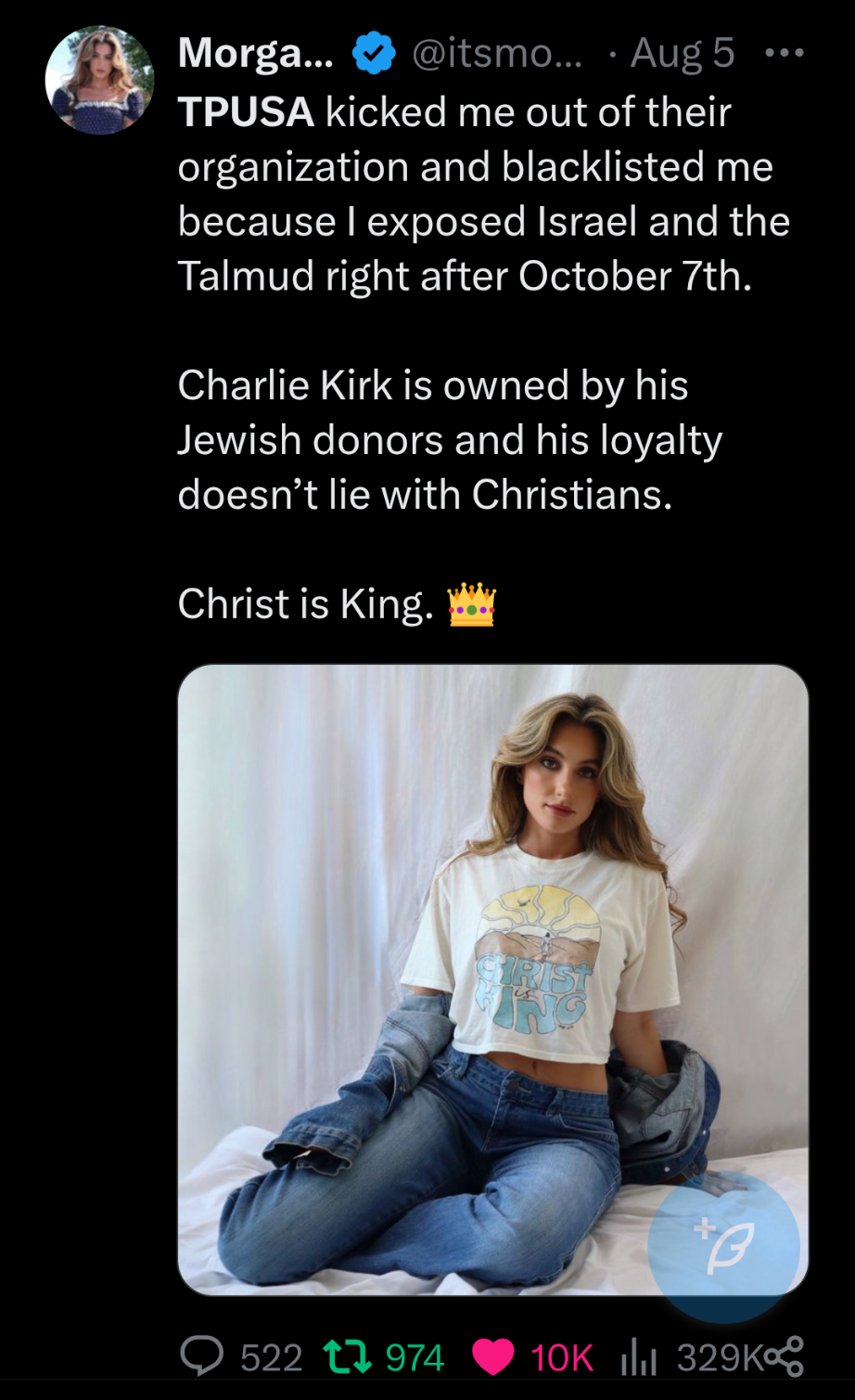 Morgan Ariel said “TPUSA kicked me out of their organization and blacklisted me because I exposed Israel and the Talmud right after October 7th. Charlie Kirk is owned by his Jewish donors and his loyalty doesn’t lie with Christians. Christ is King.”