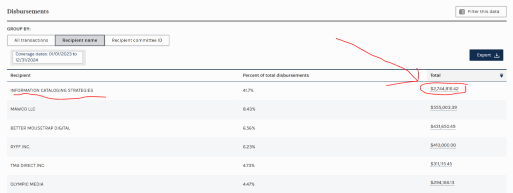 So in short 51.8% of all spendings of Scott Presler’s Early Vote Action Pac went to a company called Information Cataloging Strategies. Why That Doesn’t Add Up: