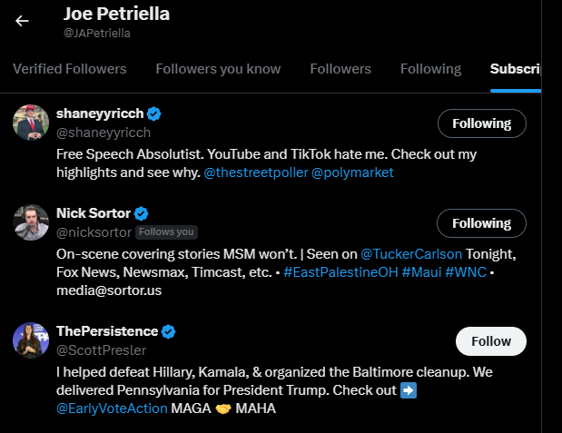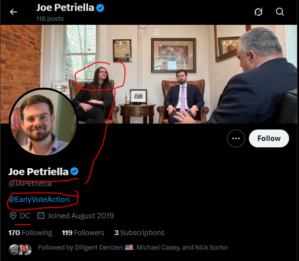 An X Profile for Joe Patriella lists @EarlyVoteAction in his profile along with a picture of Scott Presler and lists his location as DC. Astonishingly, Patriella has only 3 paid subscribers who are Scott Presler, Nick Sortor, and Shaneyyricch linking them directly to Early Vote Action. Petriella frequently reposts Scott Presler, Early Vote Action (Titled Scott Presler’s Early Vote Action) and Raheem J. Kassam (co-owner of Butterworth’s) Eric Daugherty as well.