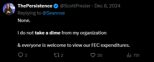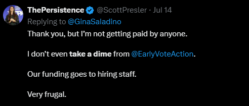 The income allegedly split through Information Cataloging Strategies directly contradicts Scott Presler’s false claim saying “I don’t take a dime from my organization.” and “ I’m not getting paid by anyone. I don’t even take a dime from @EarlyVoteAction .” It appears that Presler doesn’t take a dime, but 7 Million of them!