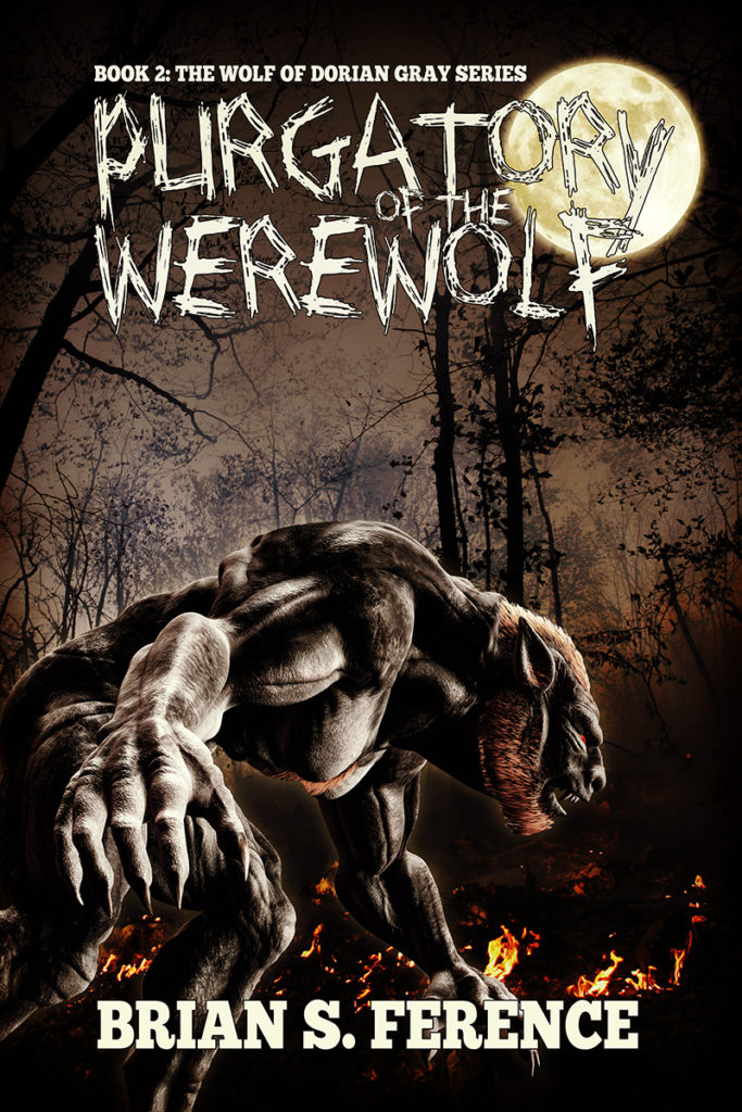 After some feedback, I emphasized the book name first and added some stroke, putting the series title in a strip. I was also excited by the effect of putting “of the” in smaller letters in-between Purgatory and Werewolf.