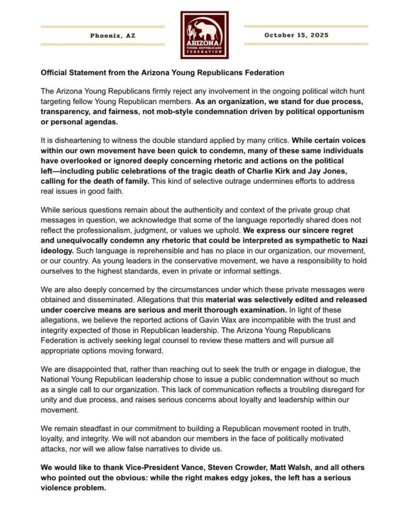 The Arizona Young Republicans released a statement condemning the “witch hunt” and expressing regret for “Nazi ideology” and noting that the materially was “selectively edited and released under coercive means”.