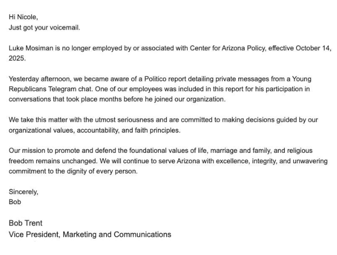 Mosiman who is the Chair of the Arizona Young Republicans was fired today from the Center for Arizona Policy per 12 News Brahm Resnik and a letter from Bob Trent their VP. UPDATE: Mosiman provided a “No Comment” and directed this reporter to an official statement from the Arizona Young Republicans at the bottom of this chat. Mosiman clarified a graphic attributing certain quotes to him were incorrect and were written by Guinta. Mosiman did confirmed his employment at the Center for Arizona Policy.