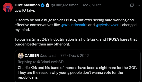 I have written many times about Tyler Bowyer and Turning Point Action’s Mount Vernon Project to seize control of the GOP at all levels. There are dozens of examples including alleged bribery in Wisconsin, Tyler Bowyer leading a coordinated influencer smear campaign and coup attempt of AZGOP Chair, and multiple failed coup attempts in several states. The Young Republican takeover by TPUSA is no exception it appears. But is the whole thing just a psyop coup attempt by Turning Point Action and Tyler Bowyer as BOTH Wax and the Racist Chatters were TPUSA aligned/paid ambassadors? Let’s take just one example of Luke Mosiman speaking to former New York State Young Republican Chair Peter Guinta, who said in the chat “I’d go to the zoo if I wanted to watch monkey play ball” and “beaner” and “sp-c”. Gavin Wax who turned over the chats to Politico wrote previously “Happy to announce I am joining @TPUSA as an official #TPUSAAmbassador”