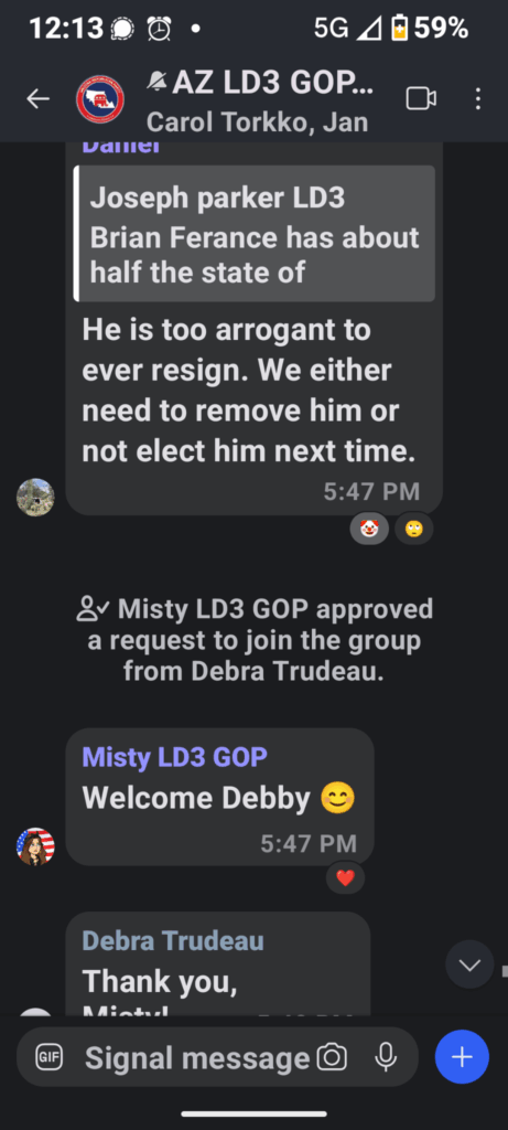Below is evidence that Candace Czarny is behind the newest legal threats against LD3 and rallied her PCs to attend Thursday’s meeting. This is one of the reasons we had 70 more pcs in attendance than the last meeting; some of which who have never attended in 6 months or ever. Significant evidence exists showing coordination and mutual support between the LD3 Chairman Stuart Scurti and his wife Colleen Scurti and Misty Portwood and her Mob. Portwood was previously exposed using Antifa BLM tactics in the Legislative District. It appears they are unfortunately working with them and with the Czarny fake LD. Portwood added several Czarny board members to her propaganda chat “AZ LD3 GOP Connect”. Czarny also requests her PCs complete a legal brief form and send it. See Screenshots and excerpts below: