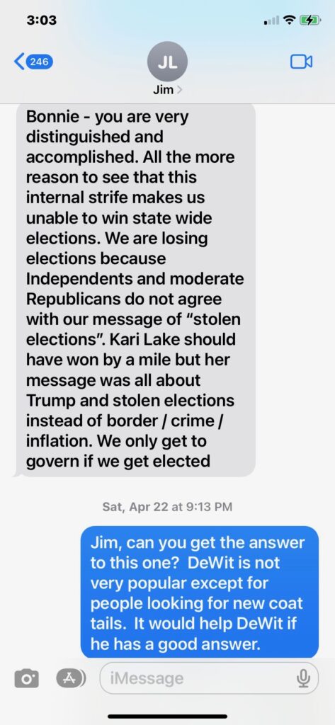 “It is an absurd and utterly false statement that Jim Lamon told you, “DeWit is working for Ron DiSantis [sic].” Additionally, your assertion that Jim Lamon does not believe election fraud is a problem is simply not true, as can be easily proven by the many public statements Jim Lamon has made concerning election integrity. Finally, your statement that Jim Lamon has been involved in “hidden schemes” that have improperly influenced Jeff DeWit’s “inexcusable, inexplicable actions” regarding elections is similarly false. Jim Lamon is not colluding with Jeff DeWit to undermine Arizona elections. This allegation is absurd.
