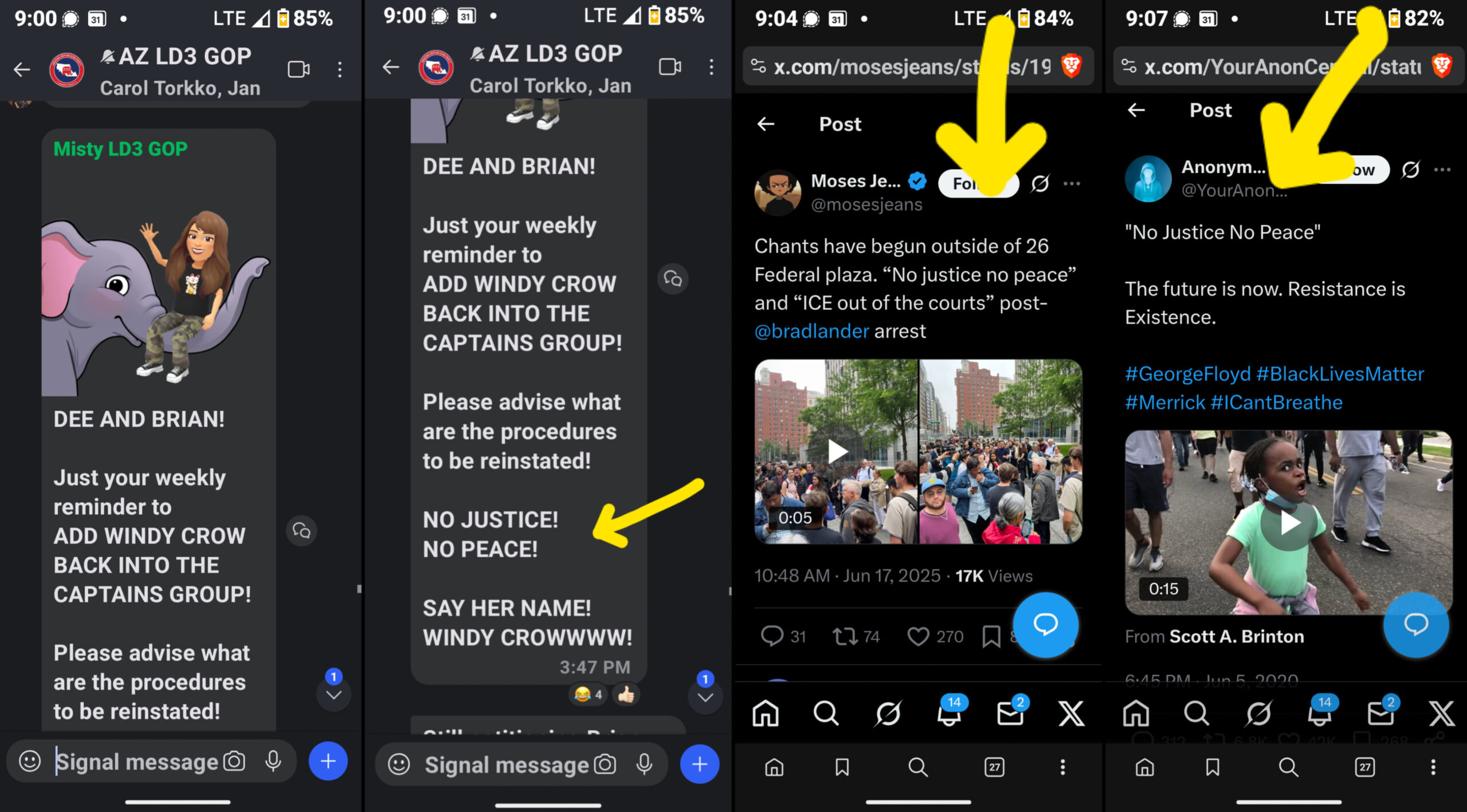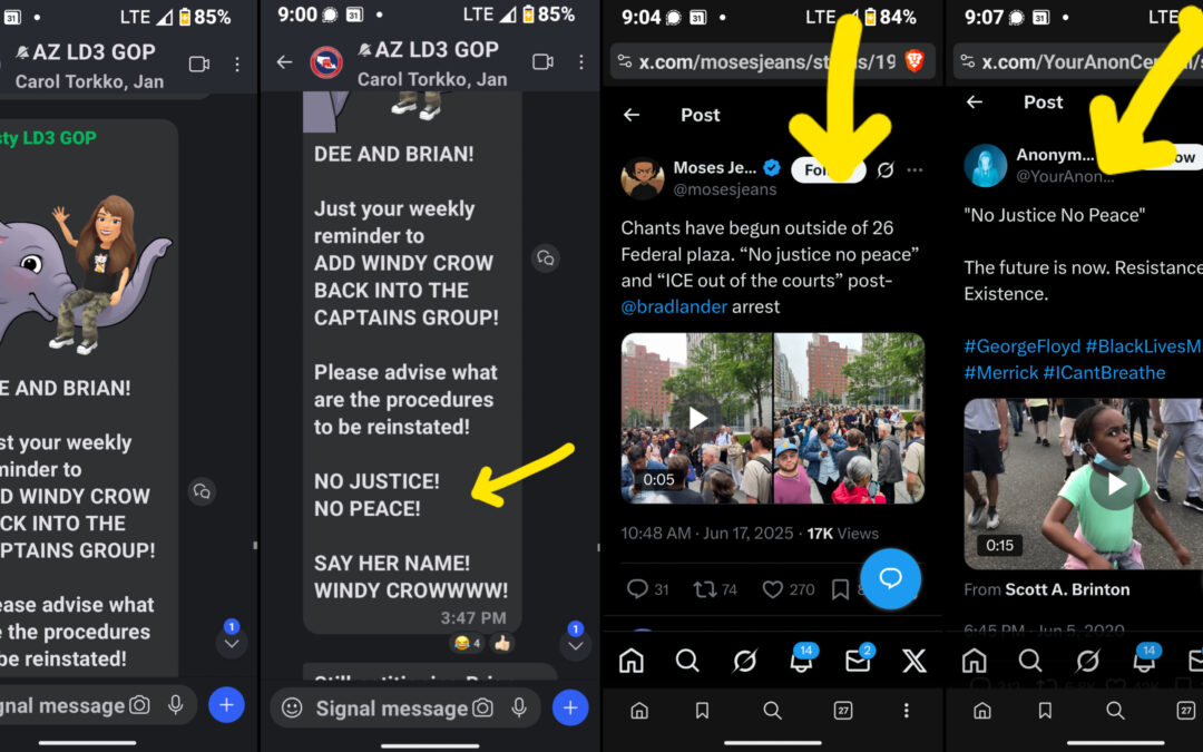 Misty Portwood Using Anti-ICE BLM Antifa Tactics to Cause Chaos in LD3 by Brian Ference | 0 comments Misty Portwood caught using Anti-ICE Antifa BLM slogan “No Justice No Peace” as she uses the same leftist tactics to cause chaos in LD3 Related posts: ASU President Michael Crow and Fake AG Kris Mayes Disrupting ICE Operations – CRU Event Met with Protests and Death Threats Czarny Farley Perry Slate Cabal Send Fake Impersonation MCRC Letter to PCs – Think & Act Like Liberals Using Deceptive Democrat Tactics 4th Peaceful Protest – Precedent Set for AZREVOTE Movement SHOW UP for County Certification Protest Monday – Any Future Violence CLEARLY FBI or Antifa Infiltrators 196 LD3 PCs Elect New Board Don’t Let it Happen in LD3 Maricopa Arizona – Allegedly Turning Point Now Appoints All Party Leadership Following Milwaukee GOP Coup State Delegate Election: Candace Czarny was NEVER the Chair of LD3 Email Proves LD3 Board Unanimously Voted to Audit & Canvas Proxies Sent to County Chair – Blocked by Candace Czarny for 2 Months As Predicted Candace Czarny Threatening Lawfare and Trying to Cancel LD3 Meeting Submit a Comment Cancel replyYour email address will not be published. Required fields are marked *Comment * Name * Email * Website Δ