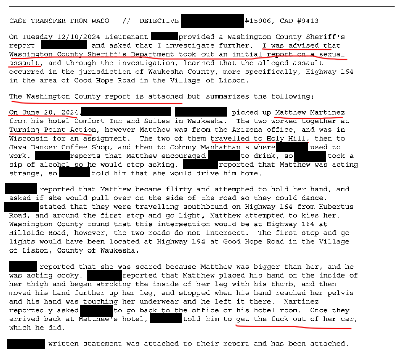 I wrote before about a former Turing Point Action employee who alleged they were sexually assaulted as referenced in the police report by a prominent Turning Point employee who was close friends with COO Tyler Bowyer. The former employee then alleges that Bowyer covered up the sexual assault by inappropriately taking over the HR investigation and having his legal counsel threaten her.