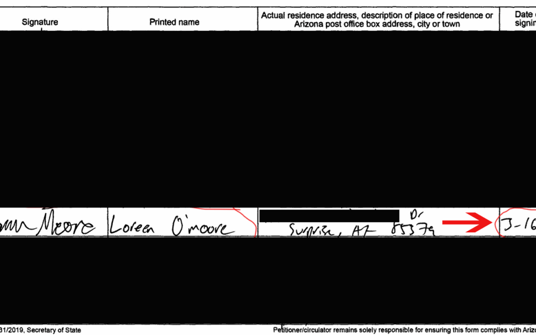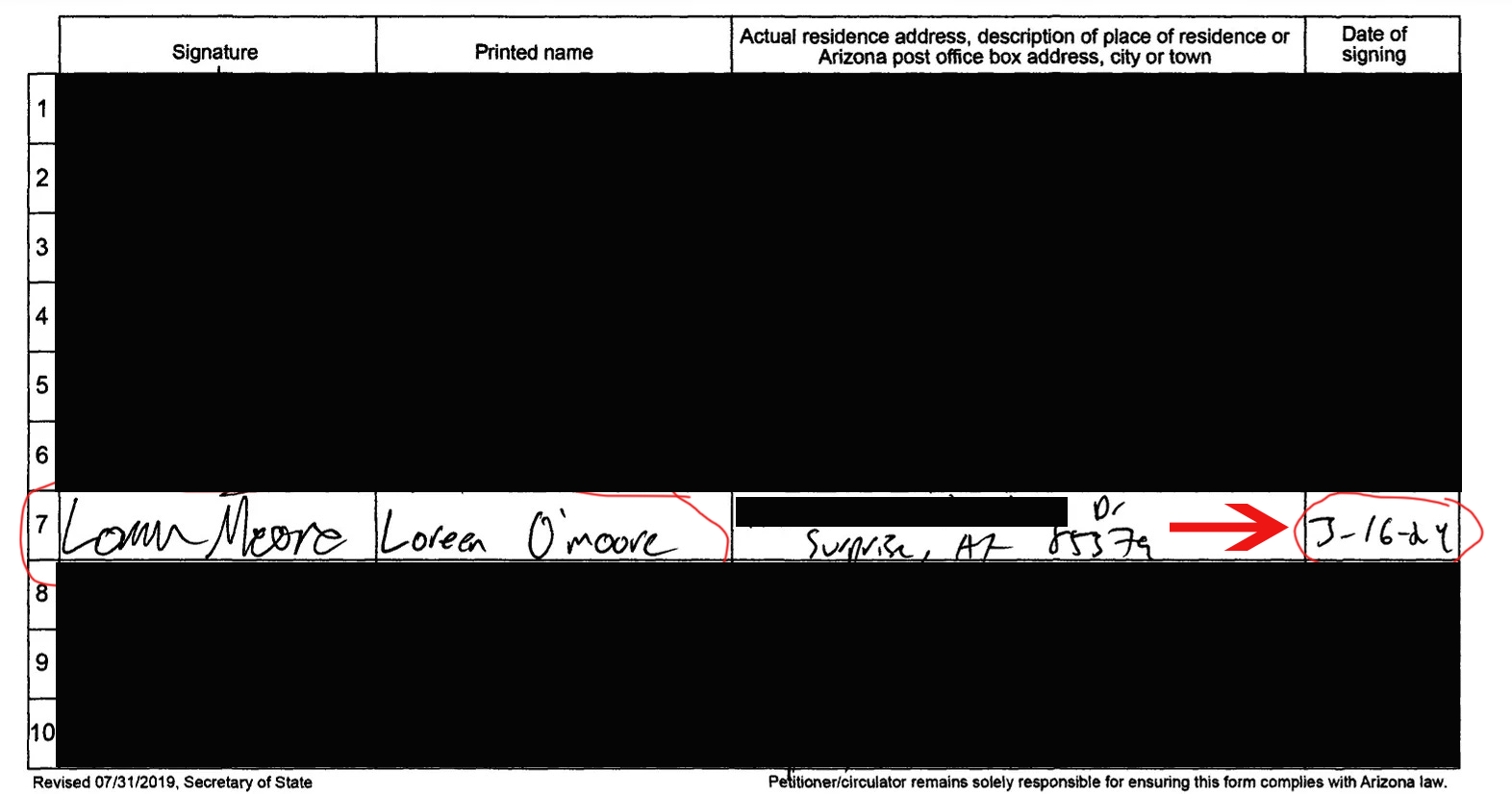 I wrote before that allegedly Turning Point Action gathered the fraudulent signatures for former Arizona Legislator and Turning Point employee Austin Smith now under indictment for felony counts. Within hours of the article being posted Smith hid his X account and scrubbed all Turning Point Action information from his profile. Now the story takes another turn as Arizona Agenda alleges that one of the signers, Loreen O’Moore as shown below, was dead and her celebration of life with family and friends held on the same day that Smith’s petition shows her signature with the date of March 16, 2024. According to the article “O’Moore’s husband, Brian O’Moore, said a “guy with a gun and a badge,” who identified himself as an investigator with the Attorney General’s Office, wanted to confirm whether the signature belonged to her, which it did not.” and “I informed him at that point she had passed away a week before it was signed,” O’Moore said “According to her obituary, she passed away 10 days before the date her fake signature appears.”