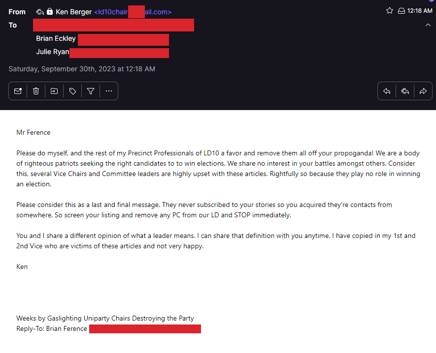 I neglected to list Ken Berger LD10 Chair in the names of the gaslighting uniparty cabal that resulted in over 220 PC Appointments being blocked for 8+ weeks. Mr. Berger rewarded that oversight with the nasty email sent below my reply: