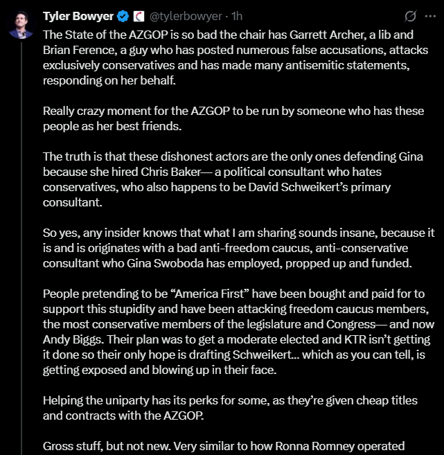 “The State of the AZGOP is so bad the chair has Garrett Archer, a lib and Brian Ference, a guy who has posted numerous false accusations, attacks exclusively conservatives and has made many antisemitic statements, responding on her behalf. Really crazy moment for the AZGOP to be run by someone who has these people as her best friends. The truth is that these dishonest actors are the only ones defending Gina because she hired Chris Baker— a political consultant who hates conservatives, who also happens to be David Schweikert’s primary consultant. So yes, any insider knows that what I am sharing sounds insane, because it is and is originates with a bad anti-freedom caucus, anti-conservative consultant who Gina Swoboda has employed, propped up and funded. People pretending to be “America First” have been bought and paid for to support this stupidity and have been attacking freedom caucus members, the most conservative members of the legislature and Congress— and now Andy Biggs. Their plan was to get a moderate elected and KTR isn’t getting it done so their only hope is drafting Schweikert… which as you can tell, is getting exposed and blowing up in their face. Helping the uniparty has its perks for some, as they’re given cheap titles and contracts with the AZGOP. Gross stuff, but not new. Very similar to how Ronna Romney operated.”