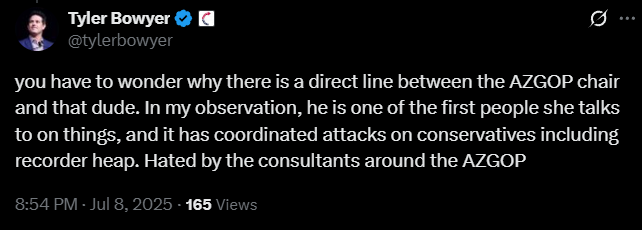 Bowyer continued to double down saying “you have to wonder why there is a direct line between the AZGOP chair and that dude. In my observation, he is one of the first people she talks to on things, and it has coordinated attacks on conservatives including recorder heap. Hated by the consultants around the AZGOP” just as a Democrat would, while evidence shows Bowyer lead his paid Turning Point Action Employees in Coordinated Attacks.