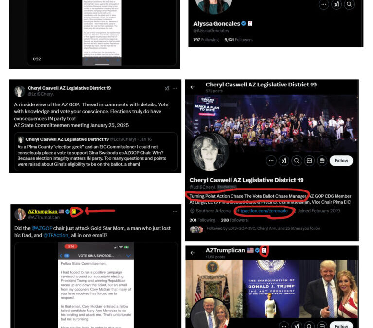TP Action employees led by COO Tyler Bowyer now appear to be running a coordinated smear campaign against AZGOP Chair Gina Swoboda. Below is screenshot evidence which is only a SMALL SAMPLE. AI defines this tactic as “swarms of nano-influencers”. This TPAction tactic seems similar to one deployed by liberals spreading propaganda, read this article “Evidence reveals Harris campaign paying young social media influencers for pro-Harris content” from the Conservative Institute.