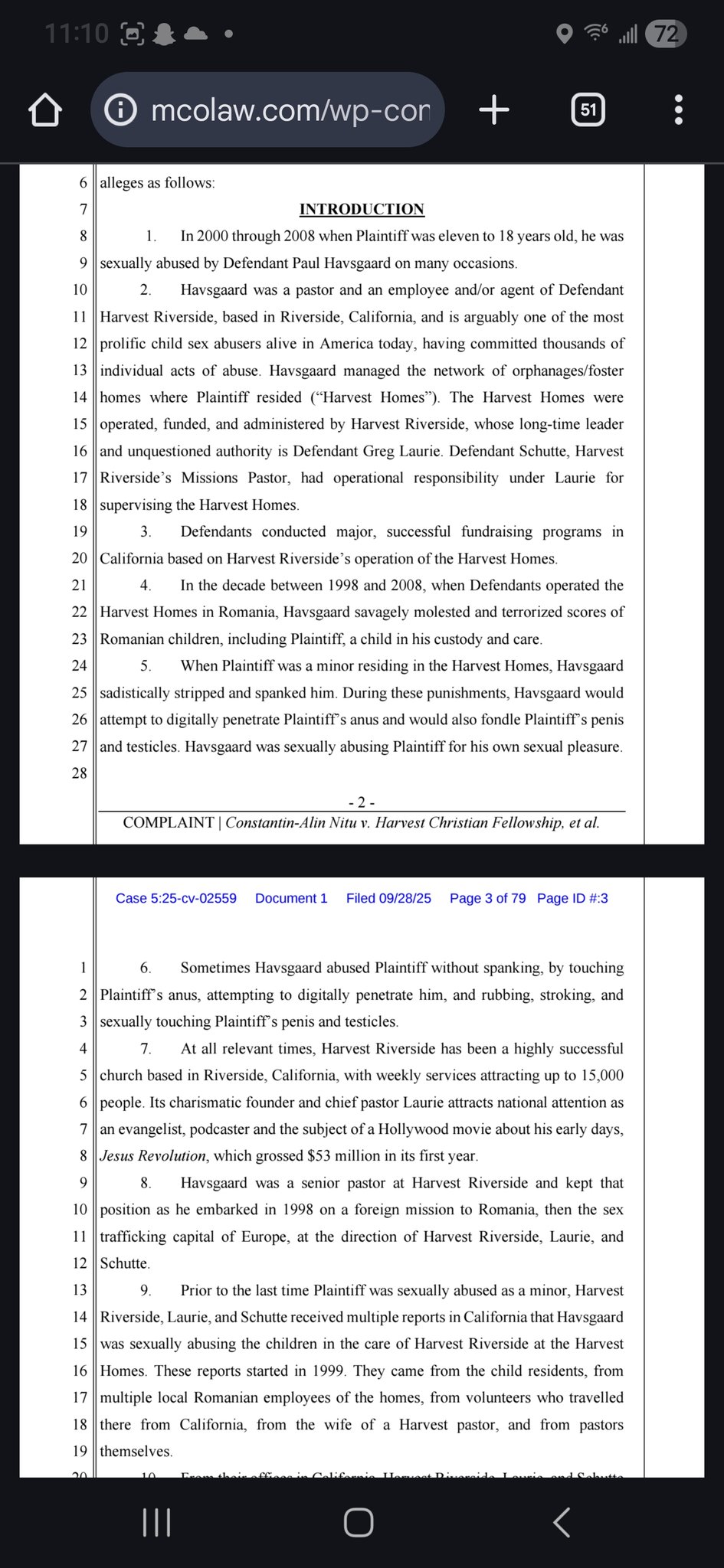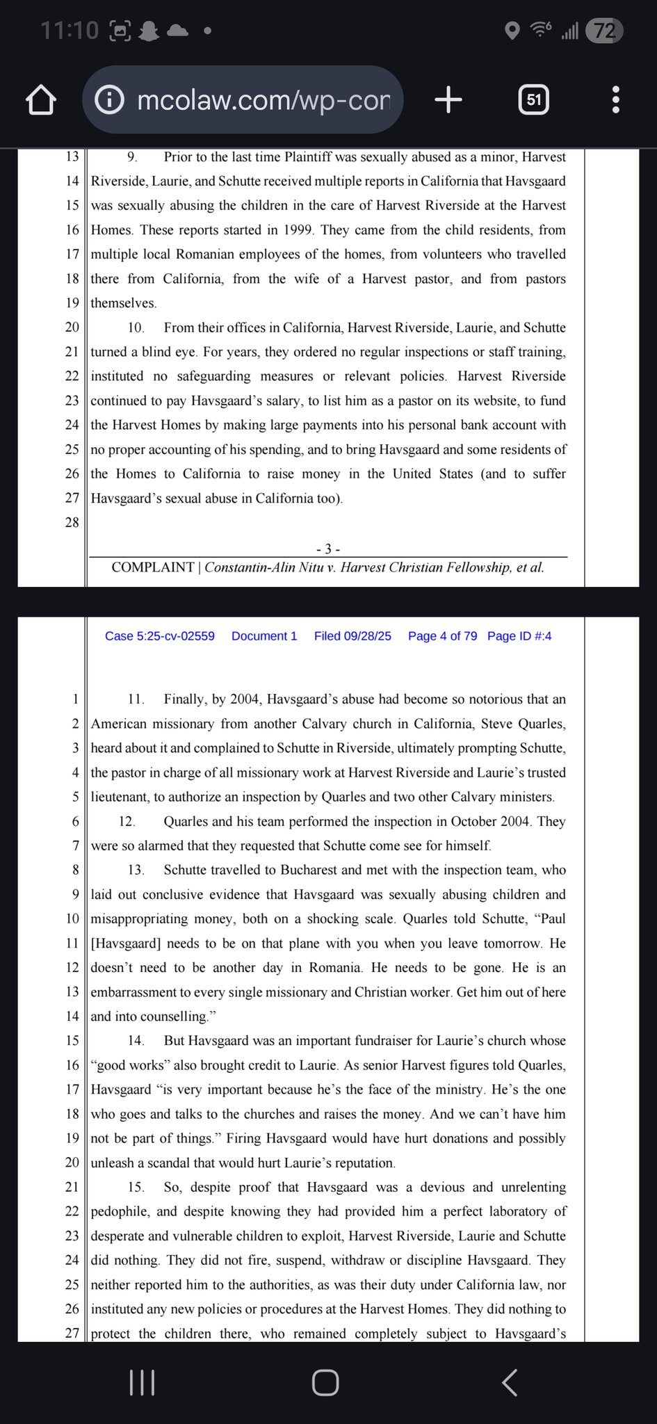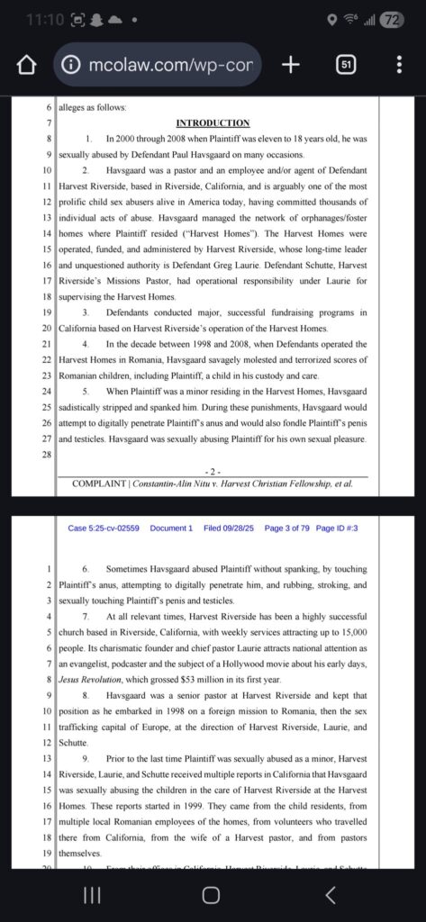 A lawsuit against the Greg Laurie and Harvest Christian Fellowship (The partners of Erika Kirk and TPUSA’s Make Heaven Crowded Tour) allege that Laurie knowingly protected and enabled a child rapist at Romanian Orphanages after multiple complaints, allowing the accused rapist to continually rape and molest children because the man brought in big dollars to Harvest and Laurie. See the shockingly graphic details in the lawsuit. Link to full filing